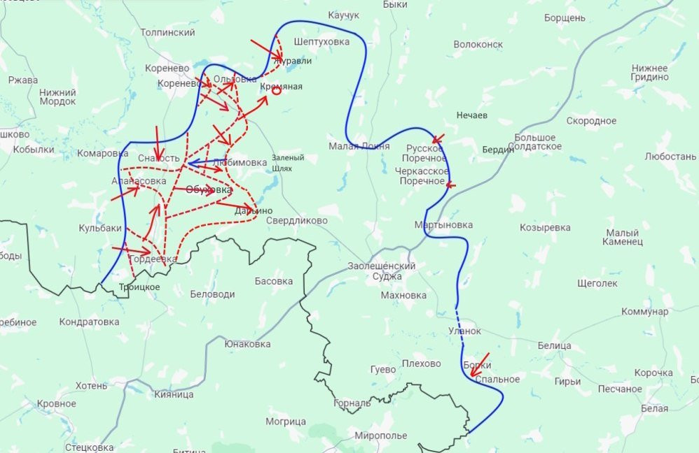 Если вкратце сказать, что происходит в Глушковском районе Курской области, где враг решил нанести удар во фланг нашей группировке, атакующей Любимовку, то выглядит это так. Противник сидит в лесопосадках около границы, потом периодически пытается заскочить на южные окраины населённого пункта Весёлое, где его убивают. После этого всё повторяется вновь, без каких-либо территориальных и тактических приобретений врага.