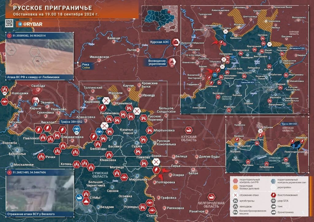Обзор ситуации в Курской области, последние новости на 19 сентября 2024 года, а также актуальная карта боевых действий, позволяющая оценить обстановку по состоянию на утро сегодняшнего четверга. Все подробности - в материале N4k.