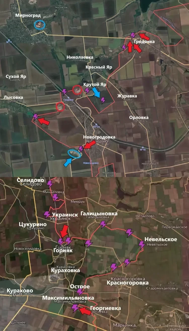 На Покровском направлении ВС России расширили зону контроля в Гродовке, на картах противника она практически полностью занята нашими войсками. Расширяется освобожденная от ВСУ территория вокруг недавно взятого Украинска. Южнее сообщают о боях на окраине Горняка и в районе Желанного Первого, информирует Telegram-канал "Два майора".
