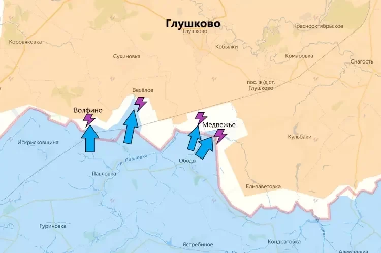 В Глушковском районе враг расширил географию ударов и атакует на трёх соседних участках. ВСУ не оставляют попыток пробиться к Волфино. Под контролем врага находится посёлок Краснооктябрьский, который располагается чуть ближе к границе. Позавчера ВСУ уже пытались прорваться к Волфино со стороны Обуховки, но попали в засаду и были уничтожены. Сейчас пробуют пробиться уже со стороны границы. Наши парни держат оборону.