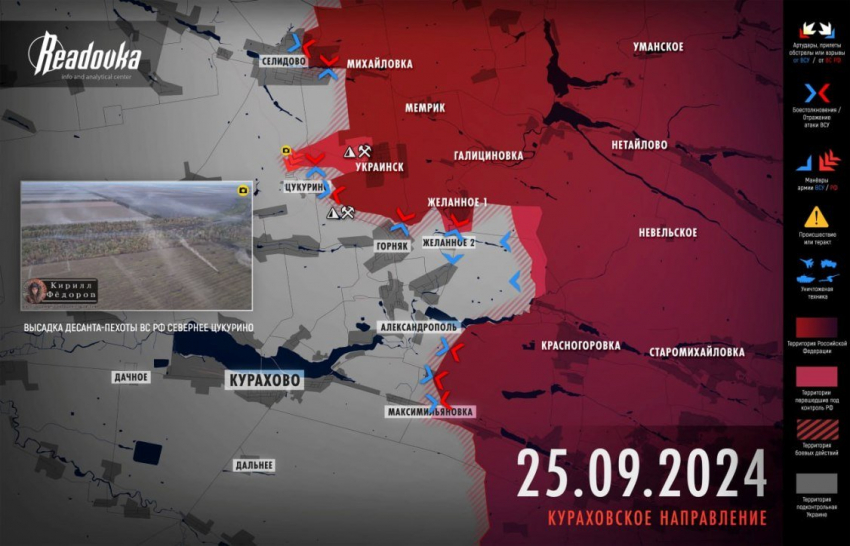 На Донецком направлении российские войска расширили зону контроля к северу от Цукурино. Параллельно с этим идут ожесточенные бои на подступах к Курахово, сообщает Telegram-канал "Рыбарь".