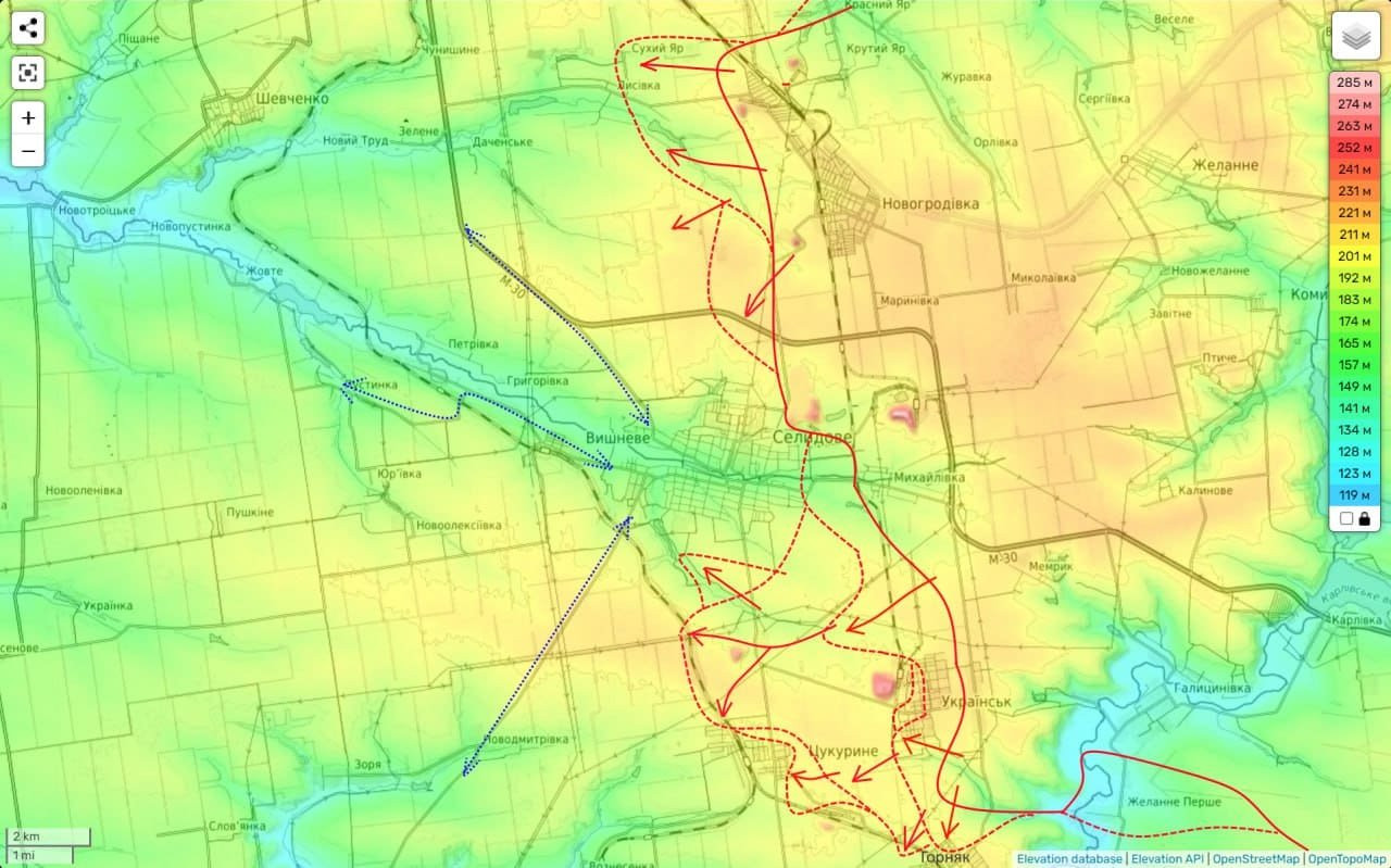 С очевидной целью (если посмотреть на обстановку южнее Селидово) взять этот город в кольцо, предварительно перерезав его главные трассы снабжения.