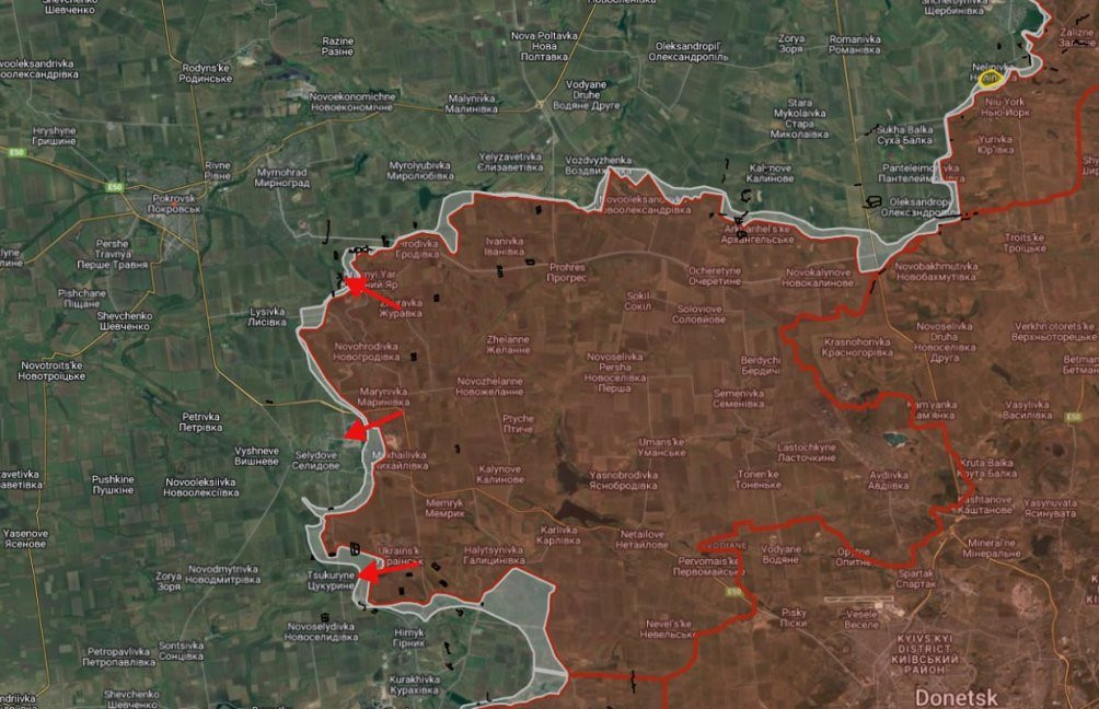 На Покровском направлении ВС РФ продвинулись севернее Селидово, отбив очередную лесополку и террикон шахты Коротченко у Мариновки. Южнее Селидово наши двигаются к охвату Цукурино с севера и юга, отбили ряд позиций на окраинах, включая Цукуринский центральный комбинат, шахту и террикон «Горняк», перерезали одну из дорог из Цукурино в Горняк, сообщает военкор Евгений Лисицын в своем Telegram-канале.