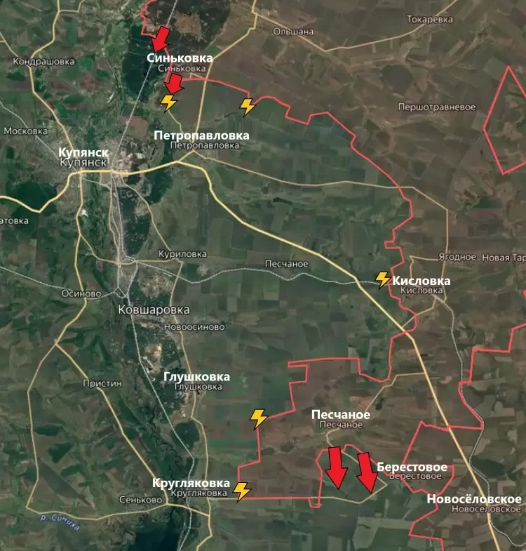 На Купянском направлении ВС РФ пытаются продвигаться западнее и южнее Синьковки, в сторону Купянска и Петропавловки соответственно. Пока что дело идёт довольно медленно - у врага было достаточно времени, чтобы подготовить здесь хорошую оборону.