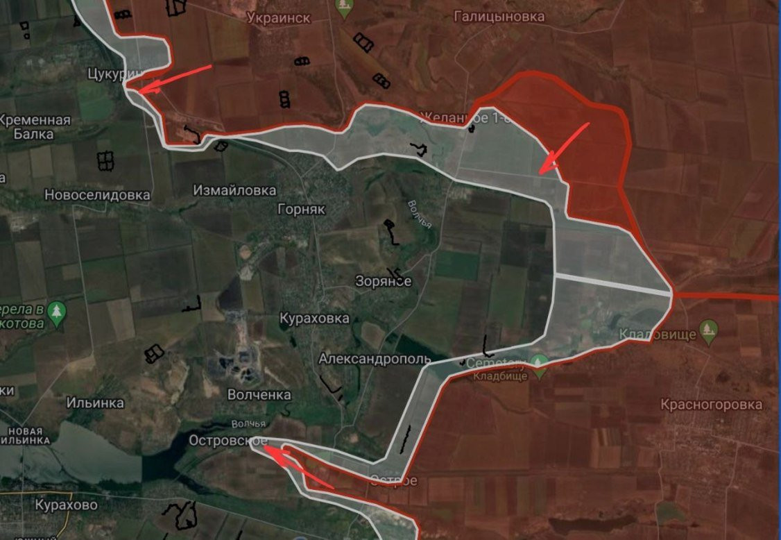 Угледарский фронт гремит. Западнее Угледара ВС РФ двигаются к Новоукраинке вдоль балки Берестовой, что севернее р.Кашлагач. Восточнее Угледара наши продвинулись ~ на 1,5 км по дороге на Богоявленку. Пройдя по берегу балки Солененькая, ВС РФ закрепились на фермах на юге Катериновки, зашли на восточную окраину. Идут бои в Максимильяновке. ВС РФ наступают от Островского к Курахово, а зайдя в Островское, наши перерезали один из путей снабжения кураховского гарнизона ВСУ. Единственный маршрут ВСУ остался через Ильинку - одна из ближайших целей ВС РФ. Угледарский и Покровский участок сливаются, сообщает Олег Царев в своем Telegram-канале.