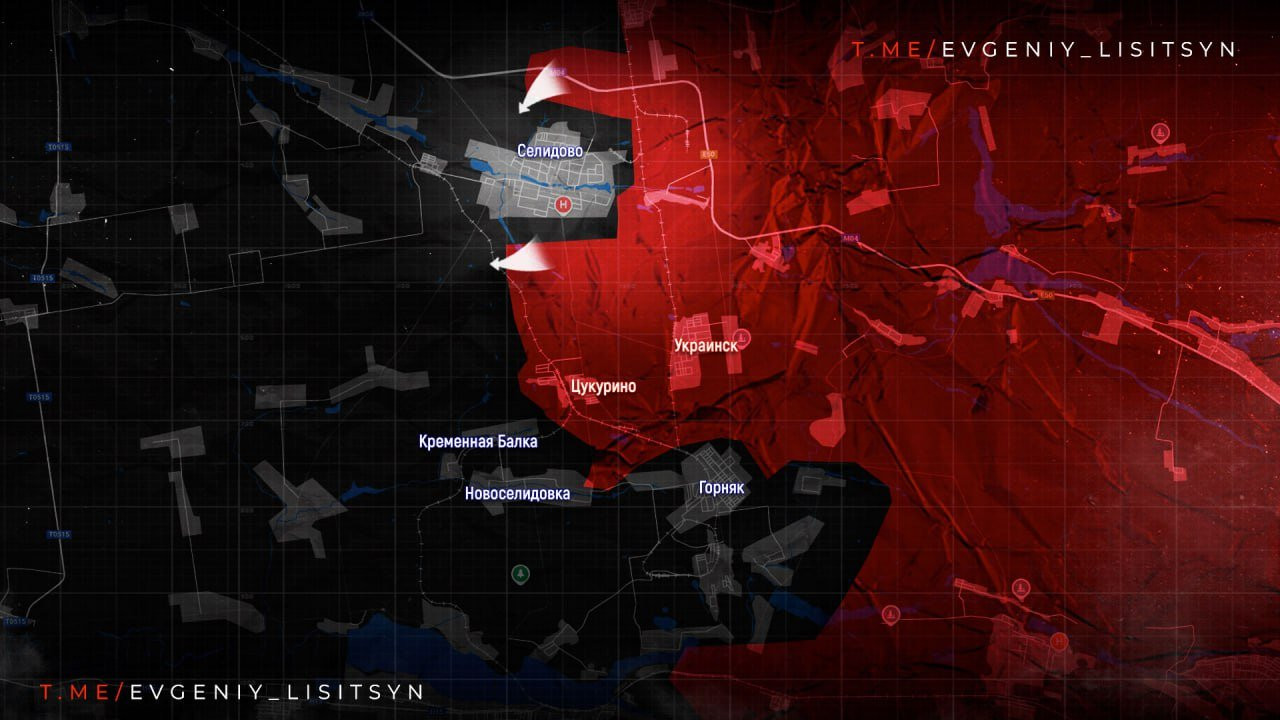 На Покровском направлении российская армия продвигается в направлении Мирнограда вдоль ж/д-линии Новогродовка-Покровск. Активные атаки ВС РФ идут в Лысовке к северу от Селидово. Оперативное окружение Селидово с трёх сторон фактически завершено.