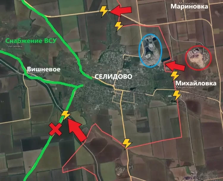 На Селидовском направлении подразделения ВС РФ продолжаются продвигаться на к северу и юго-западу от Селидово, стараясь взять населённый пункт в мешок и перерезать пути снабжения группировки ВСУ в городе, сообщает PulsePen. Для этого наши бойцы продвигаются к западу от Мариновки (на севере) и в направлении Вишнёвого (на юго-западе). Пока что полностью перерезан один из трёх путей снабжения. На восточных окраинах Селидово продолжаются встречные бои. Сообщается, что ВС РФ вернули под свой контроль завод ЖБИ у подножия подконтрольного ВСУ террикона шахты имени Коротченко.