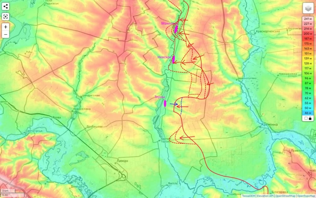 Из-за нехватки резервов у ВСУ, сложной логистической ситуации и общей обстановки на флангах противник, прикрываясь арьергардными боями, постепенно отступает на западный (высокий) берег реки, пытаясь удержать нас на давно подготовленной и укреплённой линии обороны.