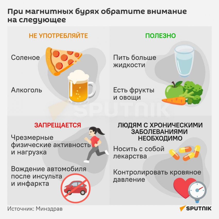 «Доказательная медицина до сих пор ставит под сомнение, что геомагнитные бури могут оказывать влияние на здоровье: изменения в космической погоде слишком отдаленные и воздействуют на человека гораздо меньше, чем, например, ежедневная физическая нагрузка. Однако клетки тела человека имеют определенный электрический заряд и могут реагировать на смену космической погоды. Поэтому если частота колебаний геомагнитного поля составляет 1-2 секунды, что совпадает с ритмом сердечных сокращений, то у людей с патологиями сердца и сосудов может ухудшиться самочувствие», - рассказала Хаишева. Ее слова приводит "Дон 24".