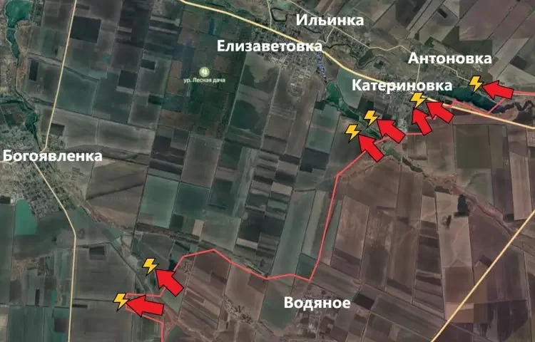 Также есть небольшое продвижение от Водяного в сторону Богоявленки. Ожидать здесь серьёзных прорывов не приходится - враг очень хорошо подготовился к обороне подступов к Богоявленке.