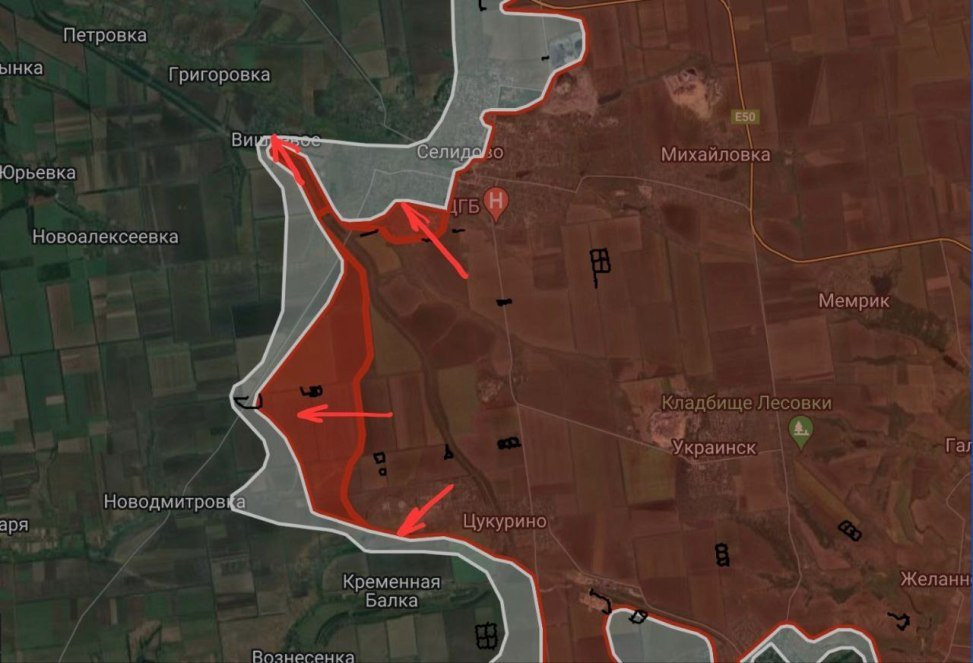 На Покровском направлении в Селидово российские войска продвинулись в южной части города на участке шириной до 1.2 км. Под контроль ВС РФ перешла юго-восточная часть Вишнёвого. Западнее железной дороги на участке от Вишнёвого до Цукурино российские войска продвинулись на участке шириной до 3.9 км на глубину до 1.6 км. Также западнее Цукурино ВС РФ давят на восточной окраине Новодмитровки.