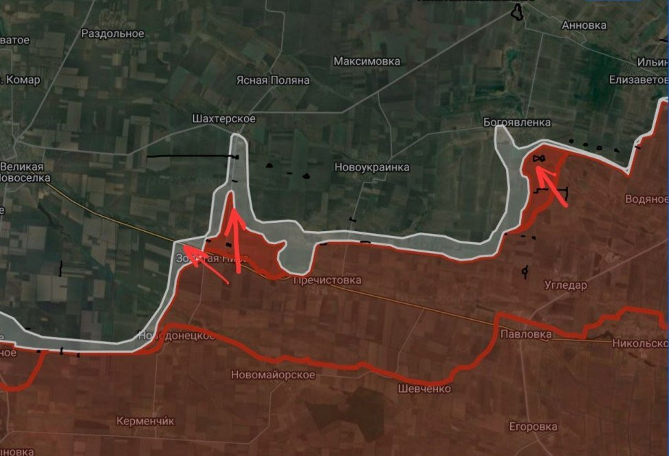 На Времевском направлении севернее Золотой Нивы ВС РФ давят в направлениях Великой Новосёлки, Шахтёрского и Новоукраинки. В районе Шахтёрского под контроль российских войск перешел участок шириной до 4.38 км на глубину до 3.2 км.