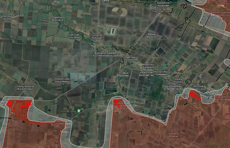 На Кураховско-Константинопольском направлении российские войска расширили контроль территории в центральной части Катериновки, продолжают давить севернее и южнее пруда в направлении Елизаветовки. Севернее Богоявленки ВС РФ продвинулись на глубину до 450 м. Под контроль российских войск перешла юго-западная часть Новоукраинки. В Шахтёрском продолжаются бои за центр населённого пункта. ВС РФ расширили контроль территории от южной фермы до Новоукраинки на участке шириной до 6 км на глубину до 3.1 км. В районе Ясной Поляны российские войска ведут штурмовые действия в направлении балки Наливач, продвинулись на глубину до 2.16 км.