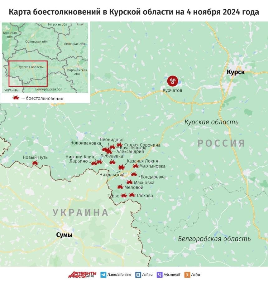ВС России ведут штурмовые действия по линии Новоивановка-Леонидово в Курской области: карта боевых действий на 4 ноября 2024 года