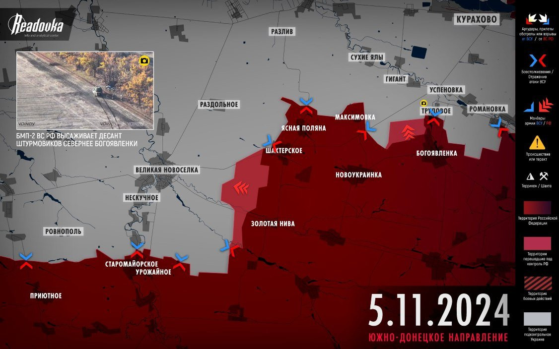 Также он сообщил, что за последние сутки под контроль российских военных был взят плацдарм между селами Максимовка и Трудовое, расположенными недалеко от Курахово. По его словам, эта территория составляет около 15 квадратных километров.