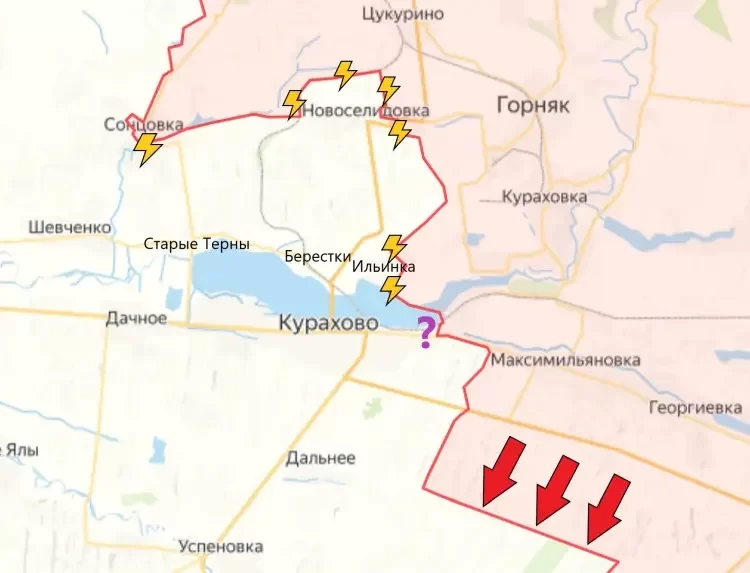 На Кураховском направлении на северном участке нашим бойцам удалось существенно продвинуться между Новоалексеевкой и Новодмитровкой в направлении Украинки. Сообщается о продвижении примерно на 3 километра на запад.