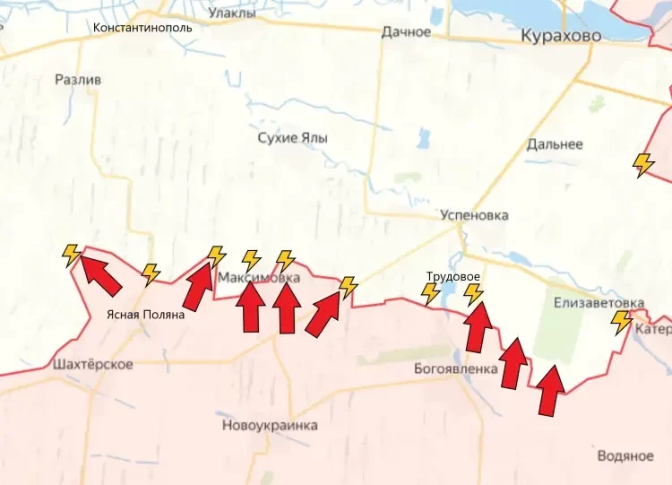 На Константинопольском направлении бойцы ВС РФ продолжают расширять зону контроля севернее Шахтёрского, Новоукраинки и Богоявленки. Сообщается о продвижении наших бойцов северо-западнее Ясной Поляны. Предположительно, так обходятся укрепления ВСУ, расположенные в трассы чуть севернее Ясной Поляны, сообщает PulsePen.