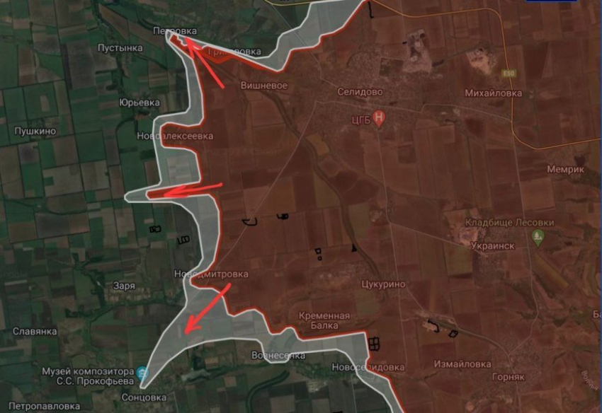 На Покровском направлении севернее Селидово российские войска давят в направлении и вдоль автодороги Е50.