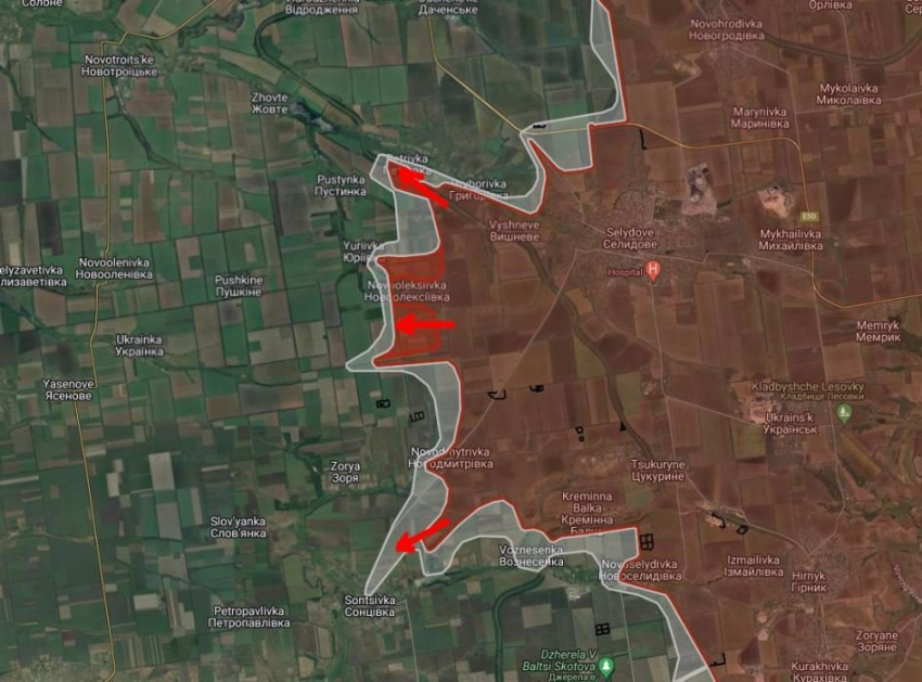 На Покровском направлении ВС РФ продвинулись в южной части Петровки на глубину до 350 м, севернее Новоалексеевки в направлении Юрьевки на глубину до 850 м, южнее Новоалексеевки на участке шириной до 1.4 км и в Новоселидовке на глубину до 400 м.