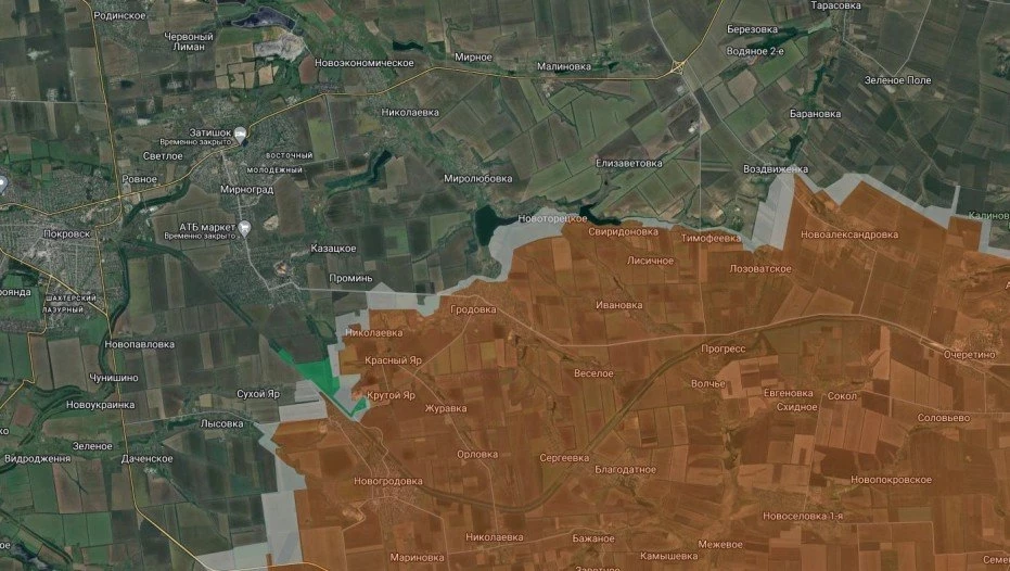На северном участке зафиксировано продвижение ВС РФ в районе Гродовки, сообщает PulsePen. Продолжаются бои в Лысовке. Установить контроль над населённым пунктом до сих пор не удаётся. Да и кадров объективного контроля с этого участка нет уже давно. Западнее Селидово наши бойцы имеют успех. Враг сообщает, что потерял контроль над Григоровкой и Петровкой. Сейчас в населённых пунктах идёт зачистка территории. Это же касается Юрьевки. Также наши бойцы продвигаются вдоль железной дороги и постепенно подступают к Пустынке - как с востока, так и с севера.
