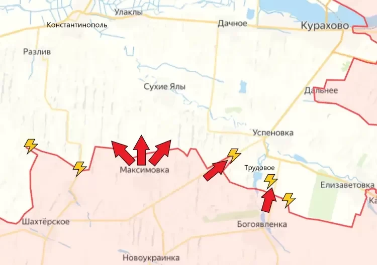 ВС РФ подошли к окраинам Новодаровки, ВСУ пытаются контратаковать в районе Ровнополя, Макаровки и Великой Новоселки, но безуспешно. Наши войска продвинулись по дороге Шахтерское-Максимовка-Успеновка, и теперь до Успеновки всего 1 км. В районе Антоновки, Елизоветовки и Трудового кипят бои. В районе Дальнего ВС РФ отбили у ВСУ опорный пункт на высоте, противник отошел в Анновку и Гигант. В Курахово ВС РФ накапливают силы на востоке города. ВСУ подорвали мост через балку, по которому снабжали группировку, и оттягивают силы в западную часть города, надеясь удержаться в многоэтажках и промзоне.