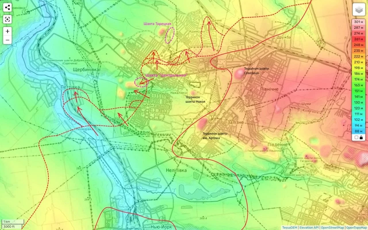 Ещё одним важным участком фронта является Торецкое направление. С недавнего времени бои здесь ведутся непосредственно внутри Торецка. В настоящее время перед ВС РФ стоит задача по установлению контроля над шахтами "Центральная" и "Торецкая".