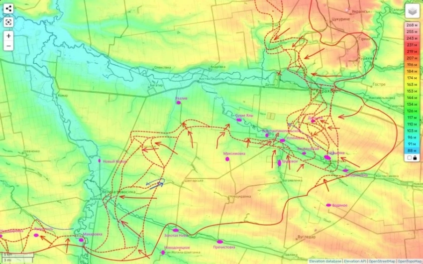 Также российские войска продолжают давить на мешок на реке Сухие Ялы с юга. Здесь они продвинулись в районе Константинопольского. А также ведут бои за Весёлый Гай.