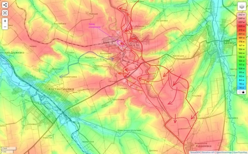 Также эксперт указывает на то, что штурм города Часов Яр продолжается с неослабевающим ожесточением. Причем, широким фронтом - от Калиново до района южнее Ступочек.
