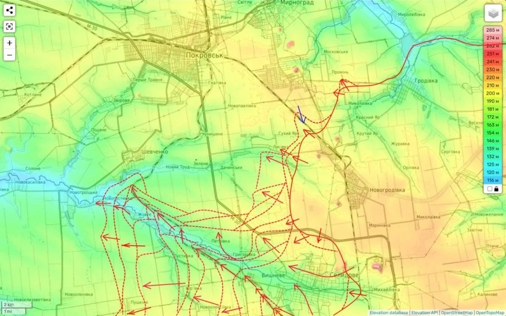 Наши штурмовые части продолжают пытаться овладеть н.п. Новопустынка. Также мы пытамеся пройти севернее н.п. Жёлтое по жд путям. Цель - н.п. Шевченко. Если ным удастся его взять под контроль, он может послужить отличной базой для дальнейшего обхода Покровска с запада.