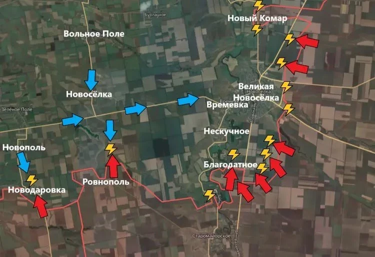 На Времьевском направлении в районе населённых пунктов Раздольное и Новый Комар ежедневно идут ожесточённые столкновения. Украинские формирования продолжают активные контратаки на позиции российских сил, сообщает в Telegram-канале военкор Евгений Лисицын.