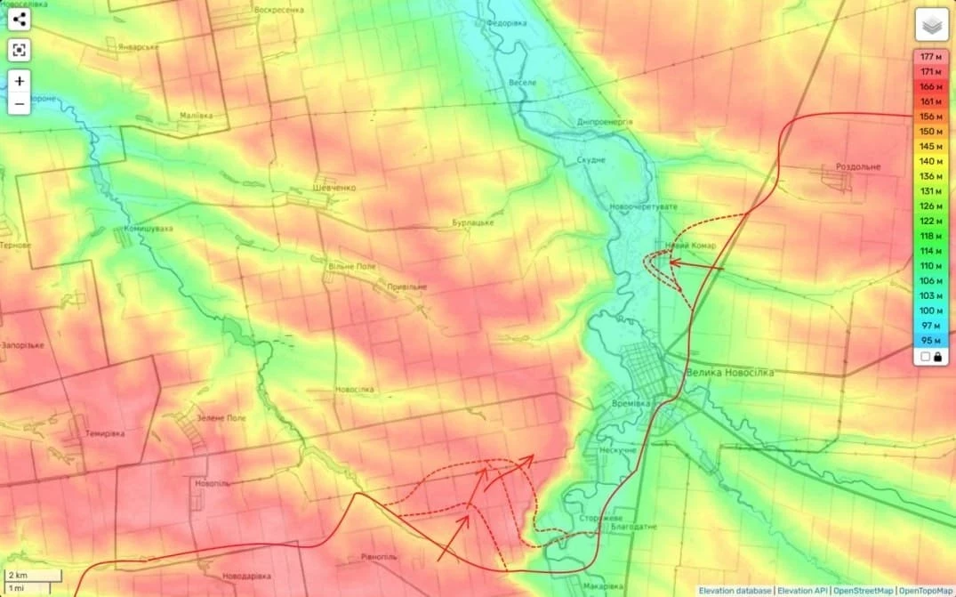 Наиболее опасными для противника на сегодняшний день являются попытки ВС России прорвать его оборонительные позиции западнее реки Мокрые Ялы, где российские бойцы наступают по холмам. Здесь мы пытаемся развить наступление на Новополь и Нескучное.