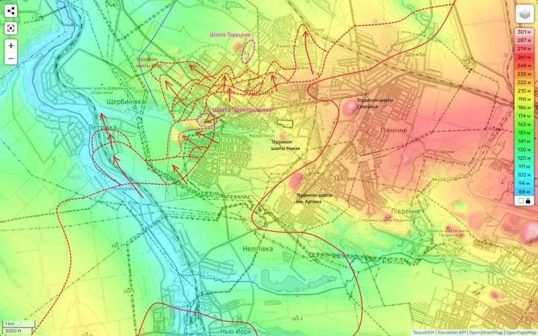 Он отошёл на линию обороны уже на административными границами Торецка. Что и позволяет нам фактически без стрелковых боёв (но под ударами FPV-дронов) занимать одноэтажную застройку города.