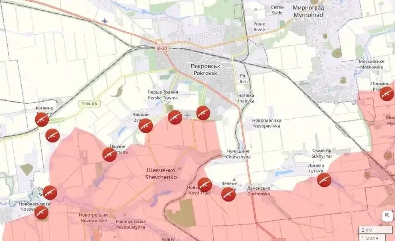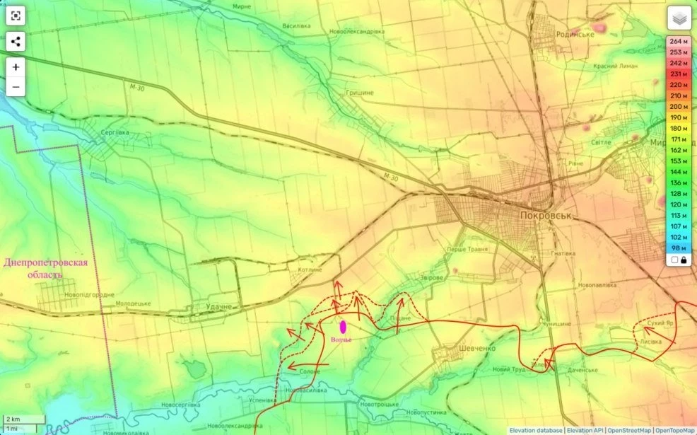 На южных подступах к самому Покровску интенсивные бои также продолжаются. Они ведутся в прилегающих к городу селах. Появилась информация об атаках российских войск на линии Песчаное – Котлино, что может указывать на планы по охвату агломерации Покровск - Мирноград с юго-запада и перерезания логистики ВСУ (через Котлово проходит железная дорога и автодорога Т-04-06 Покровск - Чаплино).