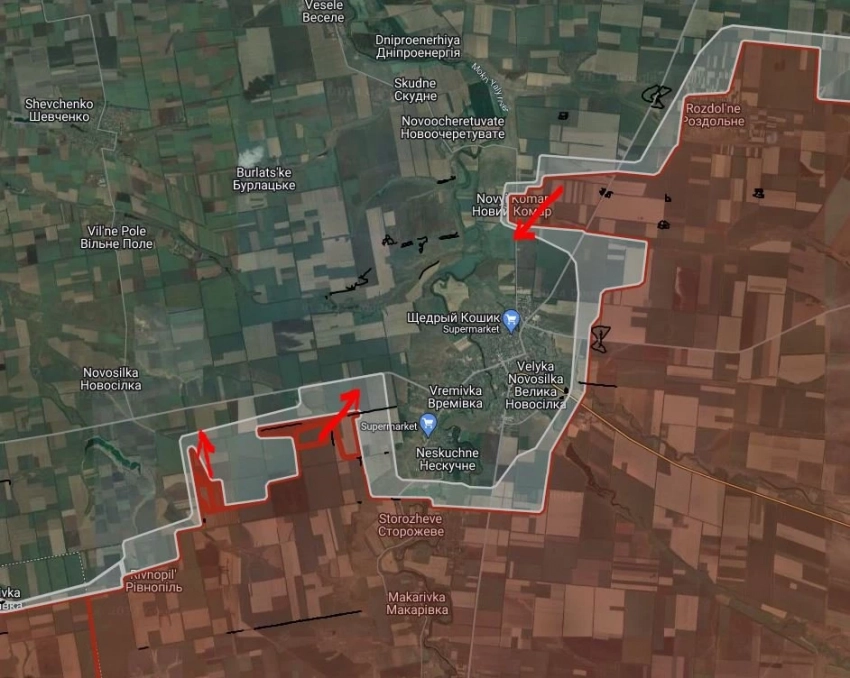 Великоновосёлковское направление. ВС РФ расширили контроль территории северо-восточнее Ровнополь на глубину до 780 м и западнее Нескучное на глубину до 1.12 км., давят в направлении автодороги Гуляйполе-Великая Новосёлка и в районе Новый Комар.