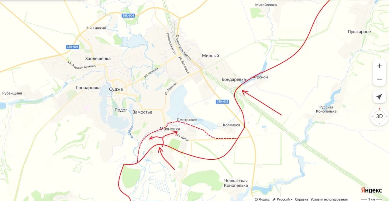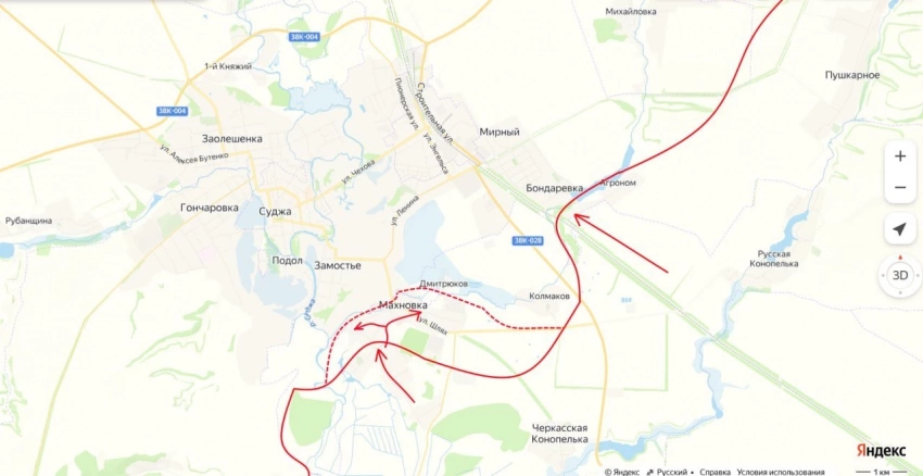 "Между тем, контуры главного удара ВС РФ и его направление постепенно начинают прорисовываться. Этот удар уже наносится с запада от Новоивановки, через Леонидово, Александрию между Лебедевкой и Малой Локней к трассе "Суджа - Льгов", - отметил эксперт в своём Telegram-канале.
