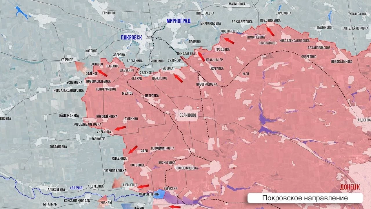 На восточном фланге Покровского направления Барановка практически перешла под контроль наших войск. Наши атакуют в направлении Тарасовки. Из-под Покровска приходят новости о том, что ВСУ отступили из Зелёного, а российские группы зачистили карман между Даченским и местным Шевченко, продолжая при этом продавливать оборону ВСУ в Чинушино. На западном отрезке этого участка наши подразделения взяли под контроль участок дороги Межевая-Покровск и вышли на подступы к Котлино, до которого осталось одно поле. Не стихает накал сражения за карьер на северо-западе от Солёного. Здесь ВС РФ решают оперативную задачу по выходу к Удачному, с северной шахты которого просматривается дорога на Павлоград. Южнее ВС РФ дожимают противника в Ясеневом, а от него до Шевченко атакуют к Андреевке.