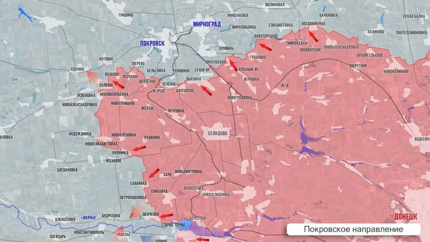 Сообщается, что после взятия ВС РФ села Соленое к югу от Покровска, российским войскам осталось около 6,5 км до админисиративной границы Донецкой народной республики с Днепропетровской областтью.