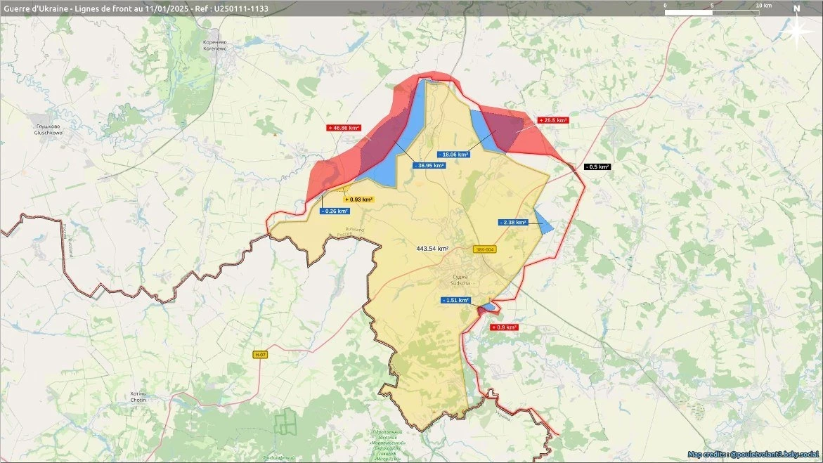 Между тем, западные аналитики подсчитали, что в настоящее время под ВСУ остается не более 443 км² территории Курской области. На пике (август - сентябрь) под оккупацией было 1200+ км².