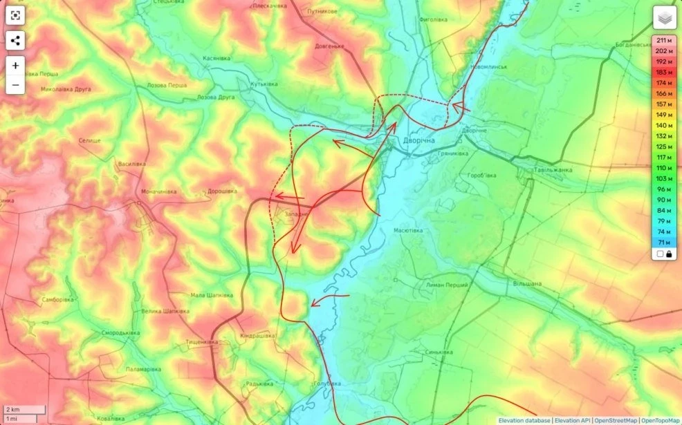 Логика нашего командования понятна. Важнейший на сейчас вопрос это логистика. Чтобы далее наступать большими силами надо налаживать устойчивые понтонные переправы через реку Оскол. Для этого надо обезопасить это место от угрозу ударов ПТУРов с окрестных высот. С юга высоты уже наши. Теперь то же самое надо сделать и севернее.