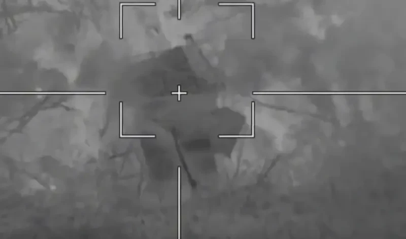 Минобороны России опубликовало кадры, на которых запечатлен момент уничтожения ударом барражирующего боеприпаса «Ланцет» самоходной артиллерийской установки украинской армии.