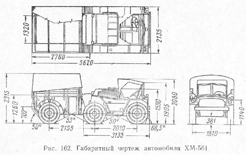 Дорожный просвет 380 мм и применение больших шин низкого давления шириной профиля 300 мм и внешним диаметром (высотой) около 1010 мм обеспечивали автомобилю великолепную проходимость. Мало того, конструкторы смогли добиться такого соотношения массы машины и площади опорной поверхности колес, при котором удельное давление на грунт составило (по моим подсчетам) всего 0,6 кг/кв. см. Это даже меньше, чем величины удельного давления многих гусеничных машин и в десять (!!!) раз меньше, чем у некоторых колесных. Для сравнения: удельное давление на грунт шин грузовых автомобилей ГАЗ-63 (передних/задних) составляло 5,14/6,28; ЗИЛ-151 – 6,24/5,22 кг/кв. см. Но основная изюминка конструкции заключалась в том, что вездеход состоял из двух секций.