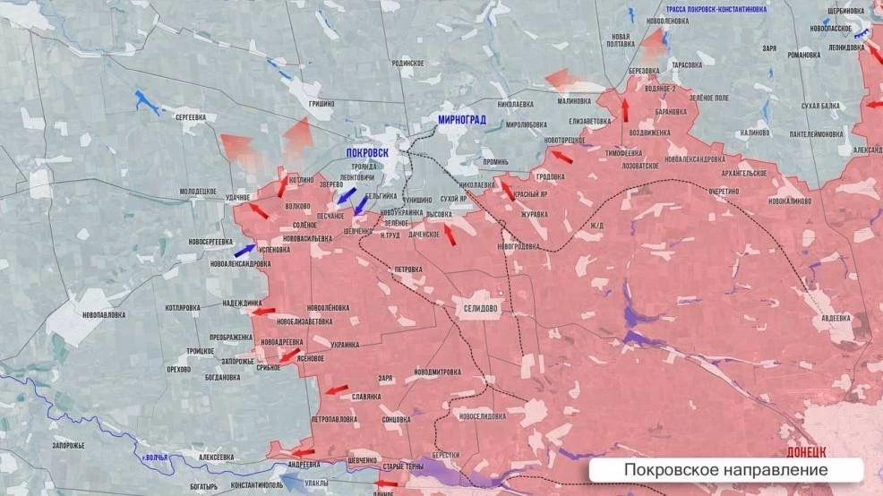 ▪️ Восточнее Покровска (Красноармейска) продолжаются бои за развязку на трассе Покровск-Константиновка, ВСУ предпринимают встречные действия. ВС России продвигаются в районе н.п. Водяное Второе. Южнее Покровска идут бои в районе Песчаного, сообщает Telegram-канал "Два майора".