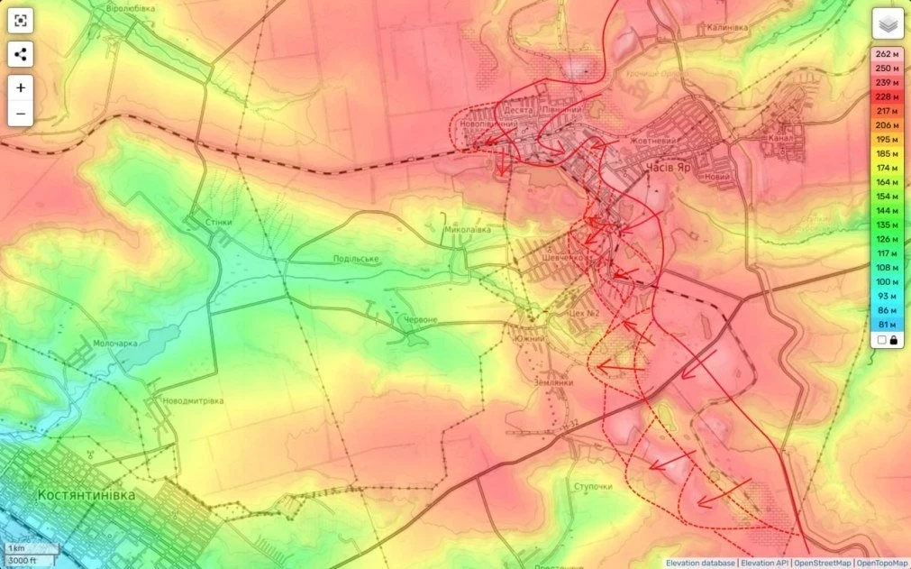 Именно сюда и уже относительно давно сместились бои на этом участке. И именно здесь мы пытаемся, заняв высоты северо-восточнее Константиновки, занять удобные позиции как для начала боев за этот город, так и для удара в тыл позициям противника, обороняющихся севернее Торецка.