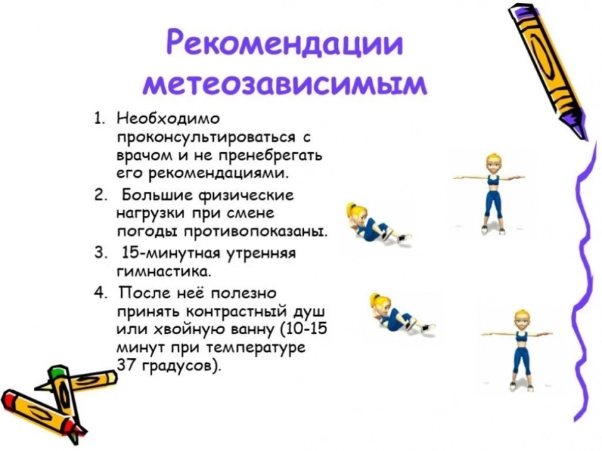 Сегодня метеозависимым людям лучше всего отказаться от изнурительного физического труда, а также эмоционального перенапряжения. Важно внимательно следить за здоровьем, так как по причине нестабильного геомагнитного поля Земли возможны такие проявления, как резкое повышение или резкое понижение артериального давления, слабость и головные боли.