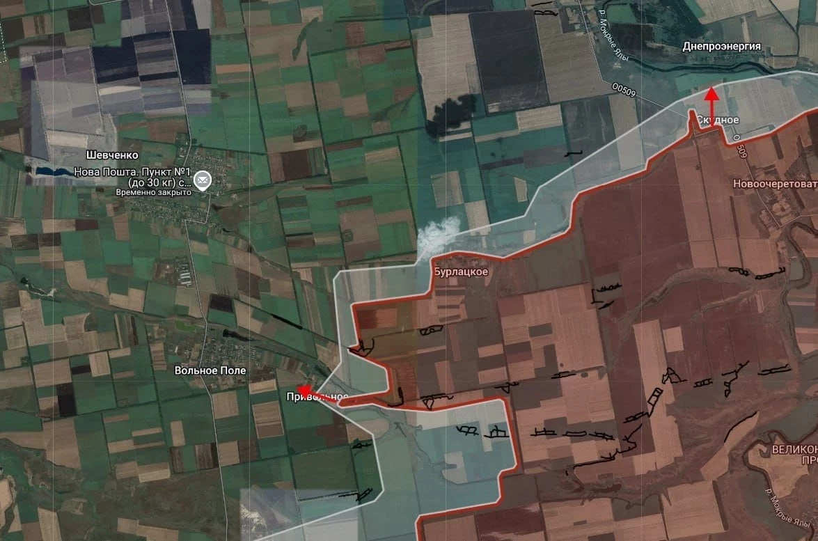 На Бурлацком направлении российские войска давят в направлении Днепроэнергии. Под контроль ВС РФ перешло Привольное.