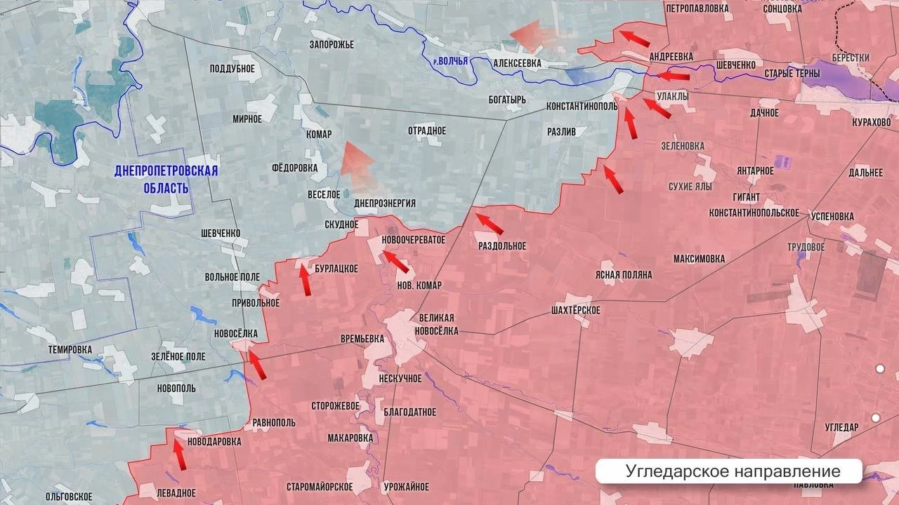 На Угледарском направлении противник пытается стабилизировать фронт к северо-западу от Великой Новоселки. ВСУ стянули сюда резервы и контратакуют в районе Бурлацкого. По данным с мест, группы ВСУ теснят наших бойцов в лесополосах к западу от Шевченко и выходили к окраинам Бурлацкого, но были уничтожены. После освобождения Днепроэнергии ВС РФ вышли к юго-восточным окраинам Весёлого и закрепляются там. От этого села до узлового н. п. Комар всего 4 км. Через него идет снабжение группировки ВСУ к западу от Константинополя, в Разливе и Богатыре. Там идут позиционные бои, без изменений.