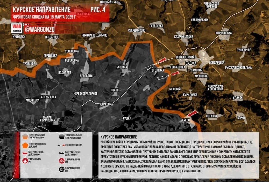 В свою очередь Telegram-канал "Два майора" в обзорной сводке от 16.03.2025 следующим образом описывает главные события в зоне СВО: