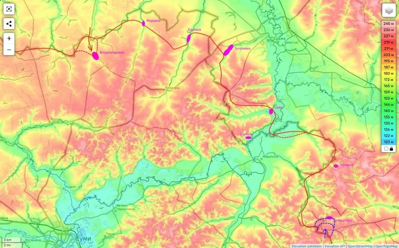 Севернее, в районе Курской области наши части зашли на территорию Сумщины в районе н.п. Владимировка и пытаются в нём закрепиться.
