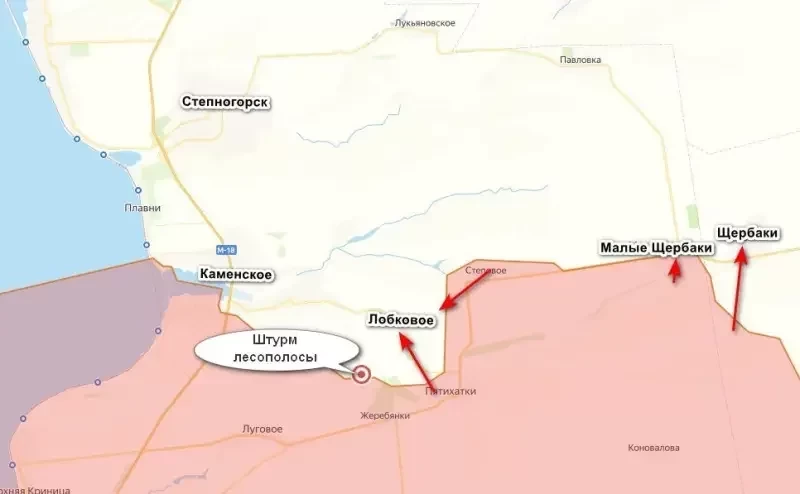 Наступление на Лобковое началось после того, как наши войска взяли село Степовое. Сейчас более активное продвижение идет именно на Степногорском участке, тогда как в сторону Орехова затормозилось. Здесь нашим нужно взять два села: Малые Щербаки и Щербаки, но противник уперся и отступать не намерен, идут ожесточенные бои. На Степногорском участке наши накануне продвинулись под селом Каменское, взяв несколько опорников ВСУ.