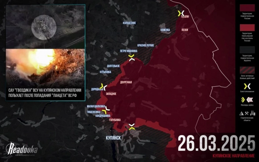 На Купянском направлении позиционные бои в районе Кондрашовки, Калиново и Западного. Сообщают о появлении плацдарма в районе Красного Первого и Каменки. Вероятно, в скором времени произойдет объединение двух плацдармов и это крайне негативно для ВСУ.